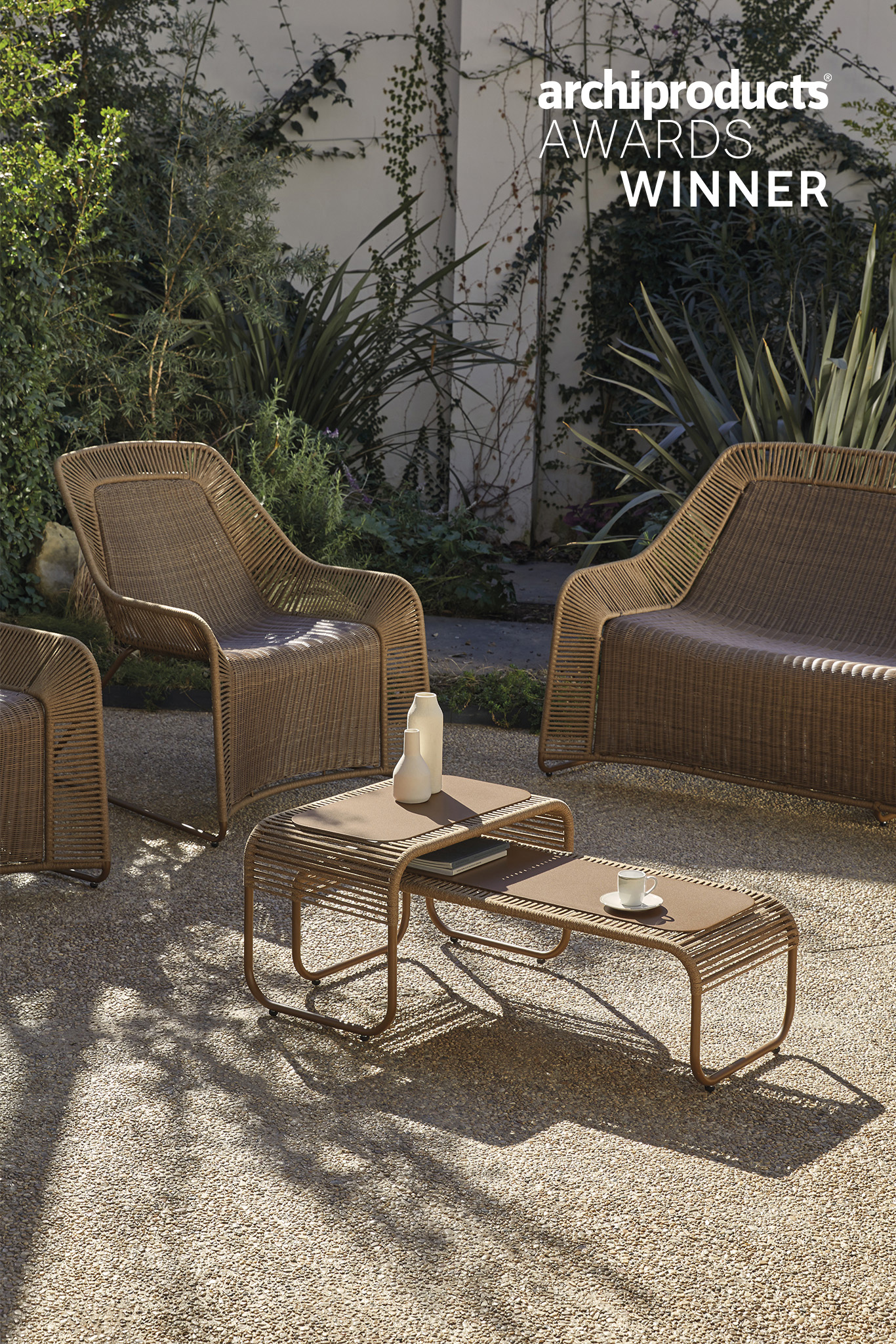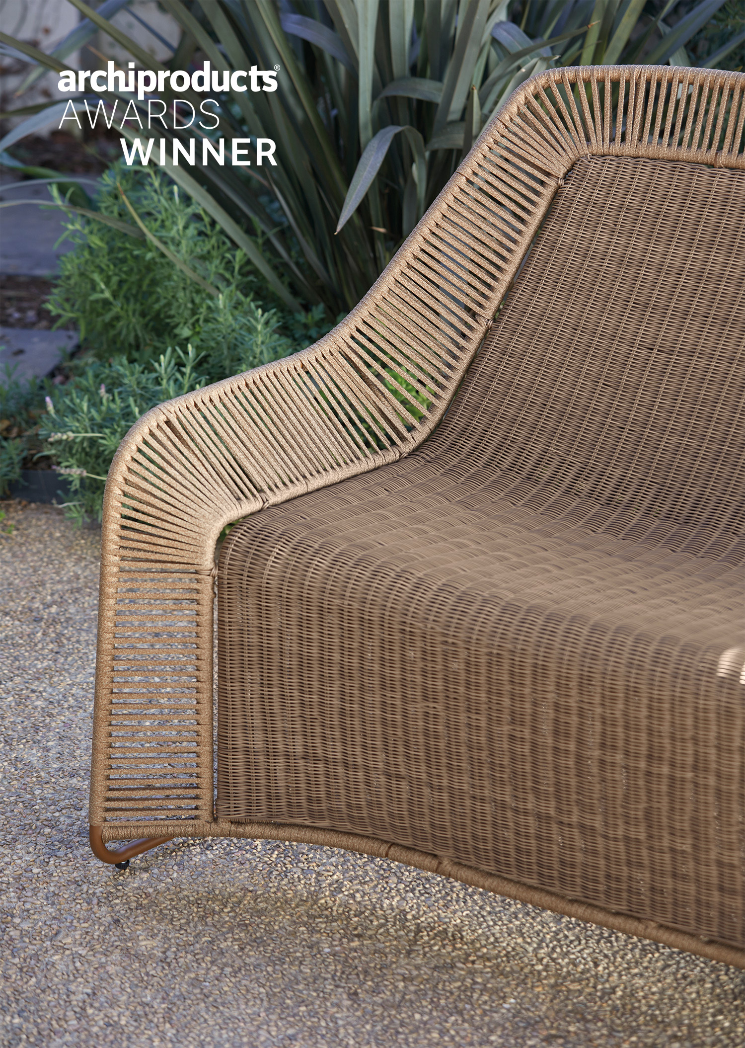 La combinación de la cuerda trenzada de poliéster, el tejido sintético y el aluminio que vertebra las piezas nos hablan de artesanía y frescura, de pureza y funcionalidad con materiales altamente resistentes a la intemperie.